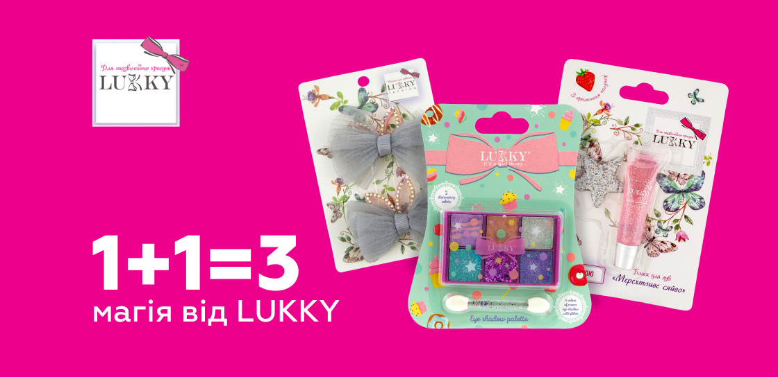 ** Под фразой «1+1=3» подразумевается, что при покупке двух единиц товара ТМ LUKKY, участвующего в этом акционном предложении, покупатель имеет возможность приобрести третью единицу товара на акционных условиях. В таком случае к трем единицам акционного товара применяется скидка, которая в суммарном размере равна стоимости 3-й единицы товара по НДС. Скидка равномерно распределяется между такими товарами.