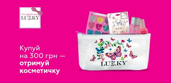 ** Под фразой «Косметичка Lukky в подарок» следует понимать следующее: при покупке акционных товаров ТМ Lukky на сумму от 300 гривен, принимающих участие в данном акционном предложении, покупатель имеет возможность получить Косметичку Lukky (код 596685) в подарок за 1 грн.