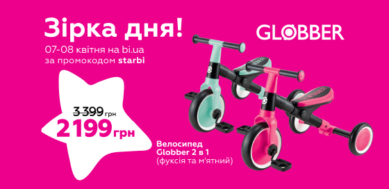 ** Покупатель имеет возможность получения скидки при использовании промокода "starbi" при покупке акционных товаров Велосипед Globber Learning trike 2 в 1 фуксия (735-110) и Велосипед Globber Learning trike 2 в 1 мятный (735-206) за 2199 грн.