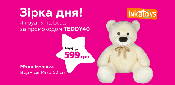 ** Покупатель имеет возможность получения скидки при использовании промокода TEDDY40 при покупке акционного товара "Мягкая игрушка Inkatoys Медведь Мика 52 см (MMI2)" за 599 грн. в период действия акции. Количество акционного товара ограничено.