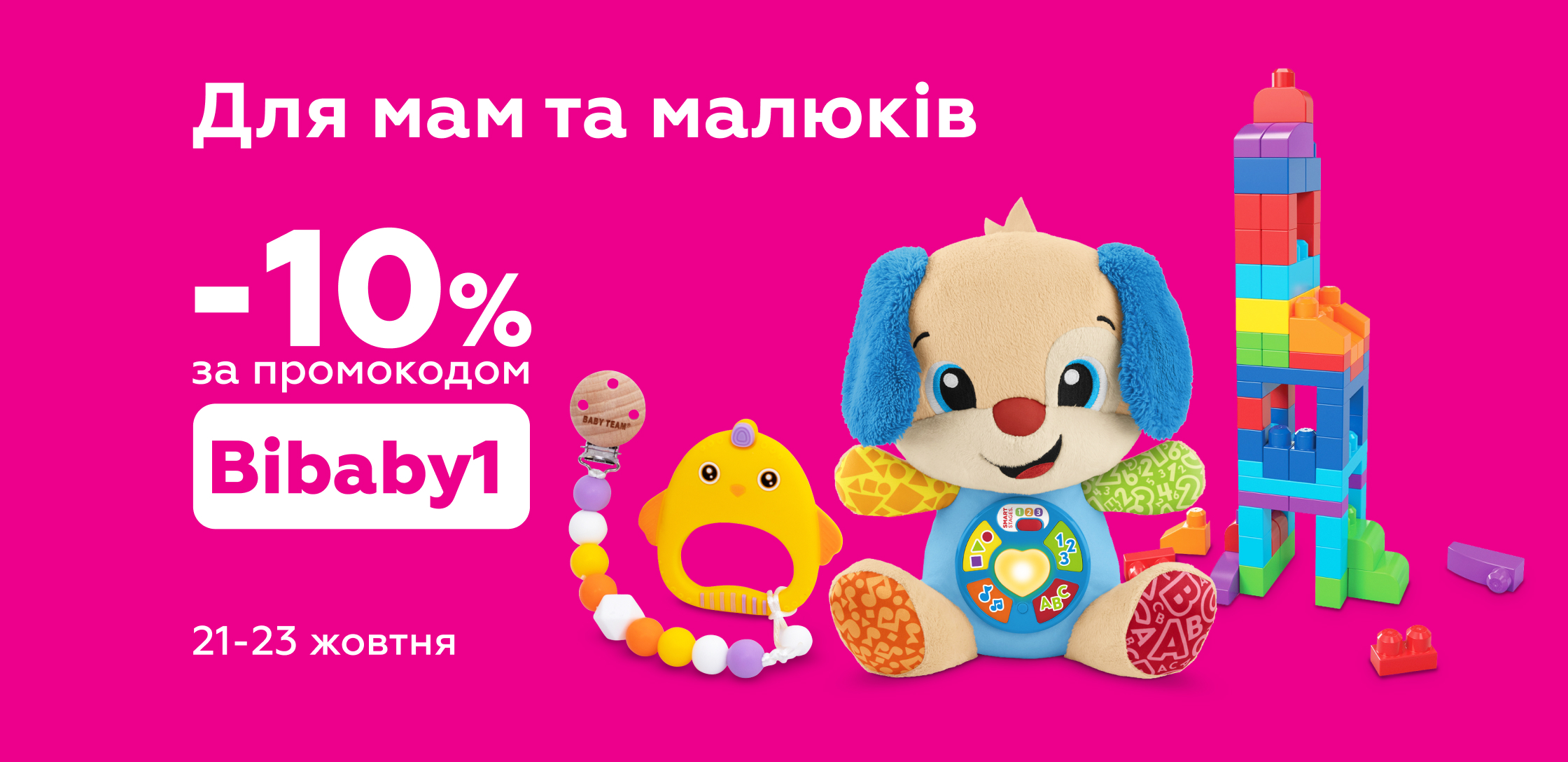 ** Під фразою «додаткові -10%» слід розуміти можливість отримання знижки у розмірі 10% при використанні промокоду Bibaby1 під час купівлі акційних товарів у період дії акції. Перелік акційних товарів наведено на акційній сторінці сайту bi.ua; кількість акційних товарів обмежена.