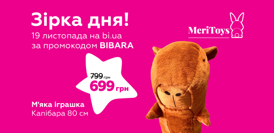 ** Покупець має можливість отримання знижки при використанні промокоду BIBARA під час купівлі акційного товару "М'яка іграшка MeriToys Капібара 80 см (2050000321849)" у період дії акції. Кількість акційного товару обмежена.