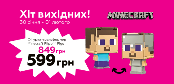 ** Під фразою «Знижка до 29%» слід розуміти можливість споживача в межах періоду акції придбати акційний товар Фігурка-трансформер Minecraft Flippin' Figs (HTL43) (599836) зі знижкою до 29% від вартості конкретного товару з ПДВ.