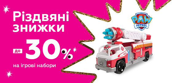 ** Під фразою до «Знижка 30%» слід розуміти можливість споживача в межах періоду акції придбати акційний товар ТМ Paw Patrol з визначеним переліком артикулів зі знижкою до 30% від вартості конкретного товару з ПДВ.
