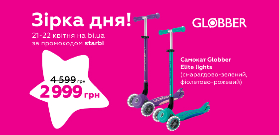 ** Покупець має можливість отримання знижки при використанні промокоду "starbi" під час купівлі акційних товарів Самокат Globber Elite lights фіолетово-рожевий (439-603-3) та Самокат Globber Elite lights смарагдово-зелений (439-607-3) за 2999 грн в період дії акції.