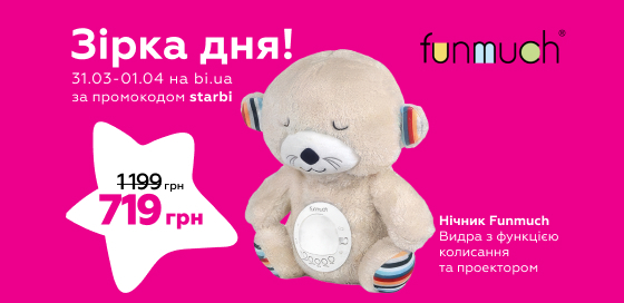 ** Покупець має можливість отримання знижки при використанні промокоду "starbi" під час купівлі акційного товару Нічник Funmuch Видра з функцією колисання та проектором (FM666-73) за 719 грн в період дії акції. Кількість акційного товару обмежена.