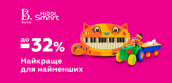 ** Під фразою до «Знижка 32%» слід розуміти можливість споживача в межах періоду акції придбати акційний товар ТМ Kiddi Smart, Battat з визначеним переліком артикулів зі знижкою до 32% від вартості конкретного товару з ПДВ.